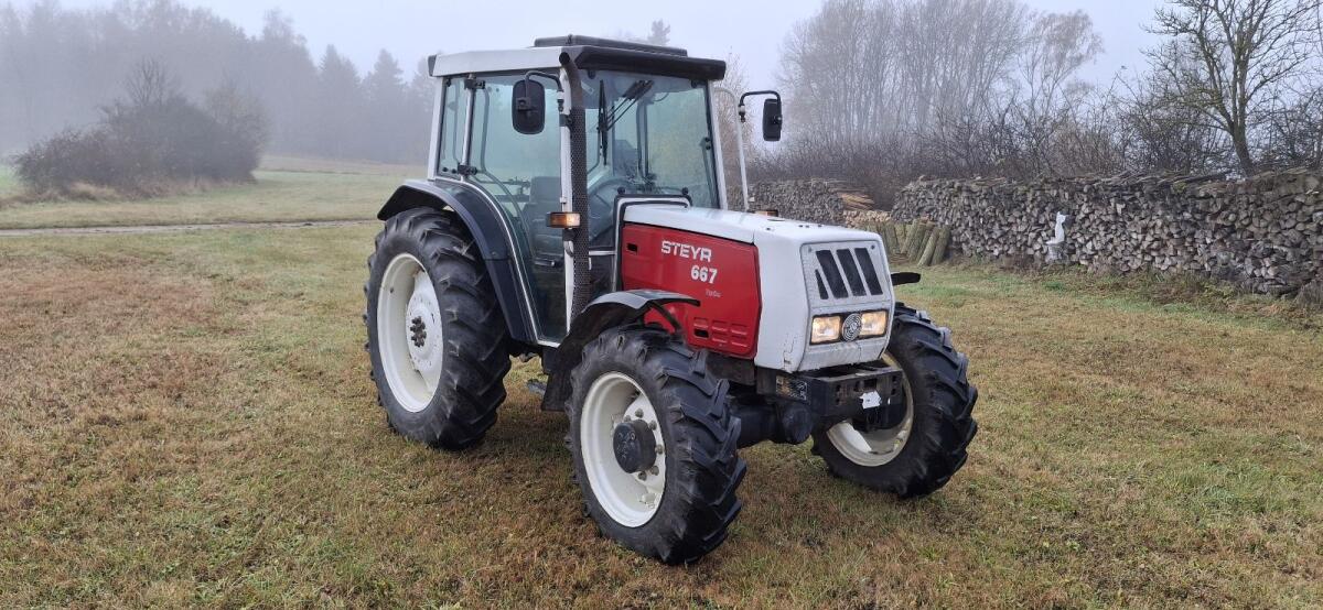 Steyr 667a, 40 km/h, EZ 11/1995, Zusatzhubzylinder, Arbeitsscheinwerfer hinten, 3xDW, 1xEW, druckloser Rücklauf, Bereifung 11.2-24 40%, 13.6-36 40%, Verstellfelgen,