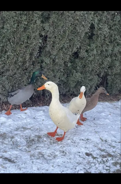 Zweijährige Enten, brave Schneckenfänger, einer der Erpel ist zu vergeben und 3 der Enten - nicht die weiße. Sind Freigänger und kommen jeden Tag zurück in den Stall