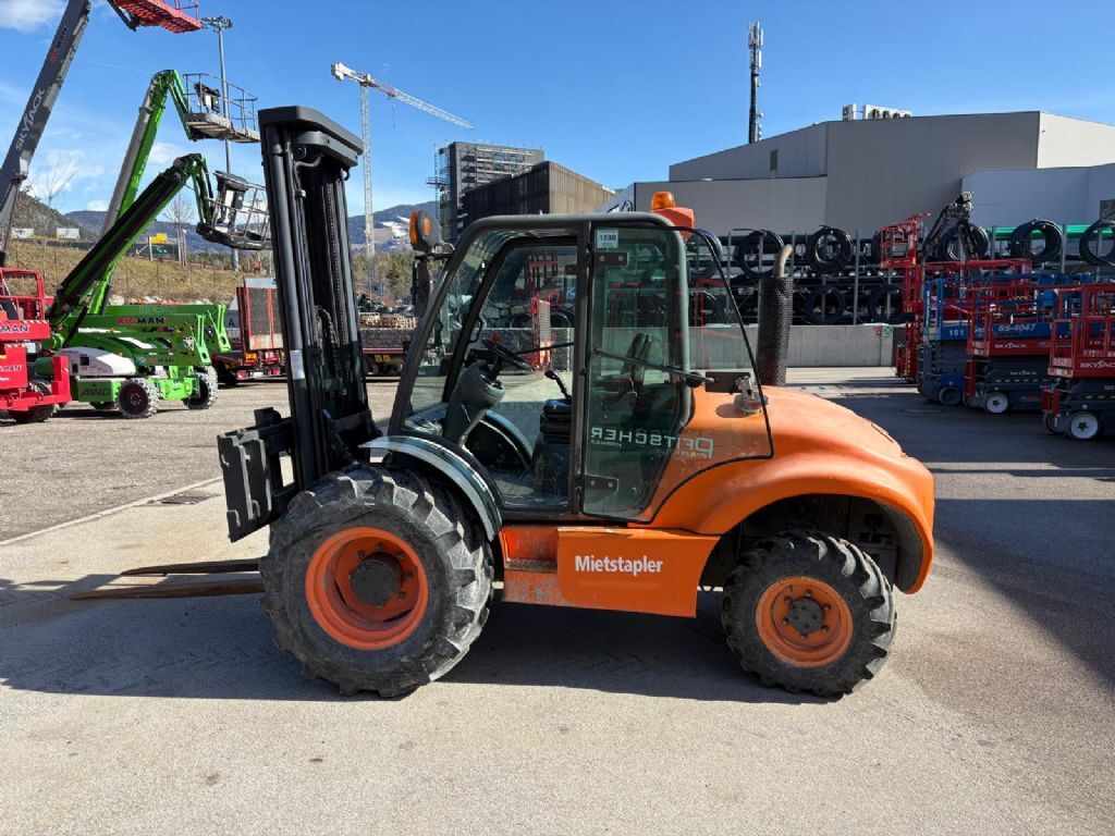Bauart: Frontstapler / Geländestapler, Tragkraft: 3500kg, Hubhöhe: 5400mm, Bauhöhe: 2700mm, Gabellänge: 1150mm, Sonderausstattung: 3. Ventil, Heizung, STVZO, Vollkabine, Außenspiegel, Joystick, Scheibenwischer,