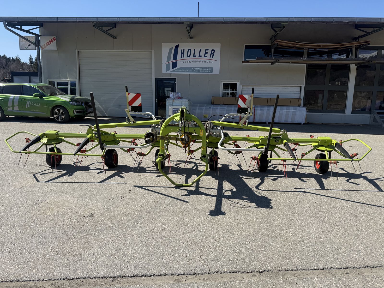 - Wender für 3-Punkt-Anhängung, Kat. II - Arbeitsbreite 6,70 m - Antrieb 540 U/min - 6 Kreisel mit je 6 Zinkenträgern - Kreiseldurchmesser 1,50 m - Kreiselgetriebe hermetisch gekapselt und dauergeschmiert - Hauptrahmen aus um 45° versetzten Vierkantrohren mit 8 mm Wandstärke CLAAS Kraftflusslenker (CKL): - Dämpfelemente für ruhiges Nachlaufverhalten, auch bei Kurvenfahrt - Direkte Abstützung des gesamten Gewichts in einer Kraftlinie gegen die Unterlenker des Traktors - Automatische Zentrierung beim Ausheben am Vorgewende PERMALINK Antriebskonzept: - Alle Kreisel beweglich miteinander verbunden - Für Klappbewegungen bis zu 180° für kompakte Transportstellung MAX SPREAD Gutflusskonzept: - Um 29,3° nach hinten angewinkelte, tangentiale Zinkenanordnung - Zinken arbeiten 33% länger nach vorn gerichtet als bei konventioneller Zinkenanordnung - Für ca. 10% höhere Arbeitsgeschwindigkeiten als bei konventioneller Zinkenanordnung - Gleichmäßige Breitverteilung des Ernteguts - Werkzeuglose Streuwinkelverstellung - Doppelfederzinken Ø 9,5 mm mit je 5 Windungen - Zinken gleichlang und in Super C-Zinkenqualität - Zinkennachlauf auf -7°/0°/+7° einstellbar - Zinkenverlustsicherung, integriert - Schutzbügelhalter aus glasfaserverstärktem GFK - Warntafeln mit Beleuchtung - Kreiselbereifung 6 x 16x6.50-8 - Transportbreite 2,97 m