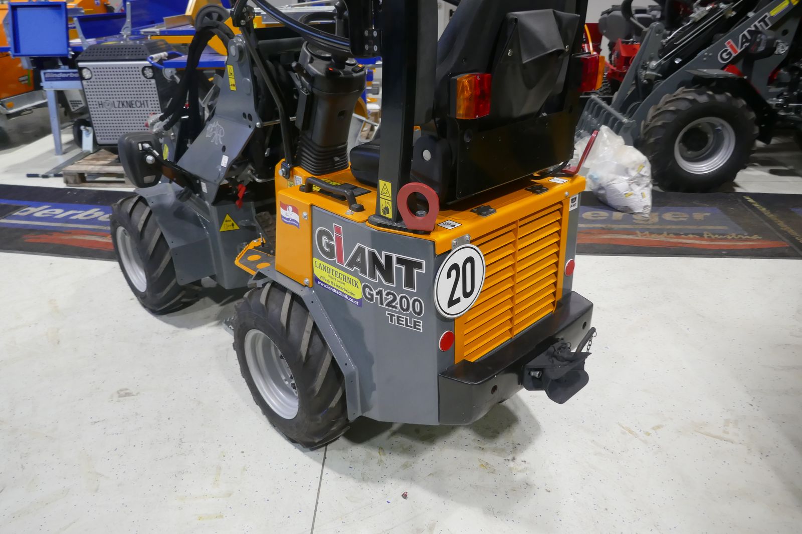 Giant G 1200 Teleskop mit Kubota Motor 25 PS, Bereifung 23x10.50-12 AS, Giant Compact Werkzeugaufnahme, Heckgewichtsplatte mit Zugmaul, Rops Fahrerschutzdach mit Sicherheitstür links und rechts, Arbeitsscheinwerfer am Kabinenrahmen unterm Teleskoparm, 3. Linie am Teleskoparm, Beleuchtung, Ausstellungsmaschine, Optional: verschiedene Werkzeuge, prompt verfügbar.
