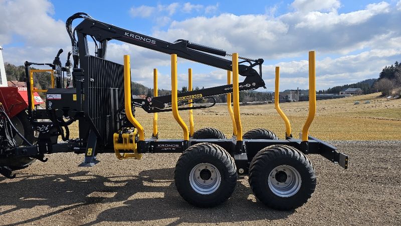 Vorführanhänger Kronos Kargo 91 mit Untenanhängung, 4 Rad hydraulische Bremse, 4 Rungenpaaren, 400/60-15,5" Bereifung, Deichsellenkung mit zwei Zylinder, A-Kranstativ, Beleuchtung hinten, Handwinde zum Abstellen des Anhängers. Kronos Gripto Kran 406 mit 6,1m Reichweite, Flanschrodator mit Gehänge inkl Pendelbremse, Prehydraulik Joystick Steuerung am Stehpodest. (Kann auch am Traktor montiert werden.). Eigenölversorgung mit Gußpumpe und 75 Liter Öltank.