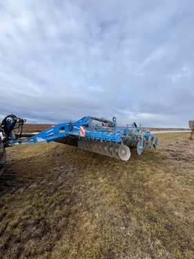 10m Kurzscheibenegge Lemken Heliodor im Fahrwerk Lemken Gigant 10/1000, doppel Profilringwalze, Stuetzfuss