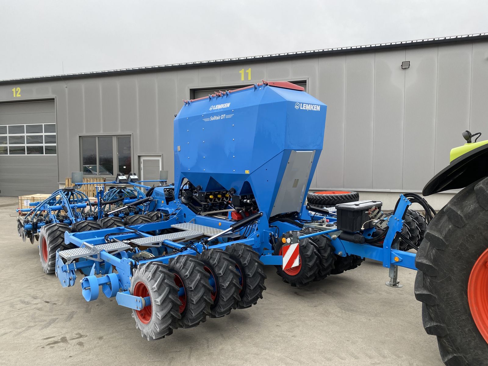 Lemken Solitair DT 600 Vorführmaschine, ungefähr 400ha, Anhängekupplung K80, zweireihiges Arbeitsfeld mit gezackten Hohlscheiben (465mm), Reifenpacker mit integrierter Bodenanpassung, hydraulisch angetriebenes Gebläse, außenliegender Saatgutverteiler, Vorbereitet für Betrieb von beliebigem ISO-Bus Terminal, wartungsfreie Doppelscheibenschare OptiDisc M, Doppelsaatgutbehälter mit 5.100L Volumen, Elektronische Füllstandsüberwachung, elektrisch angetriebene Dosierwelle, 2 Dosierradsätze, 6m Arbeitsbreite mit 125mm Reihenabstand, hydraulische Vorauflaufmarkierung, Saatstriegel auf die gesamt Arbeitsbreite, Behältersieb + Staubfilter, spritzwasserdichter Staukasten, hydraulische Tiefeneinstellung, vorlaufende Reifenpackerwalze 6m, 2-Leiter Druckluftbremsanlage, LED-Arbeitsscheinwerfer + LED-Behälterbeleuchtung