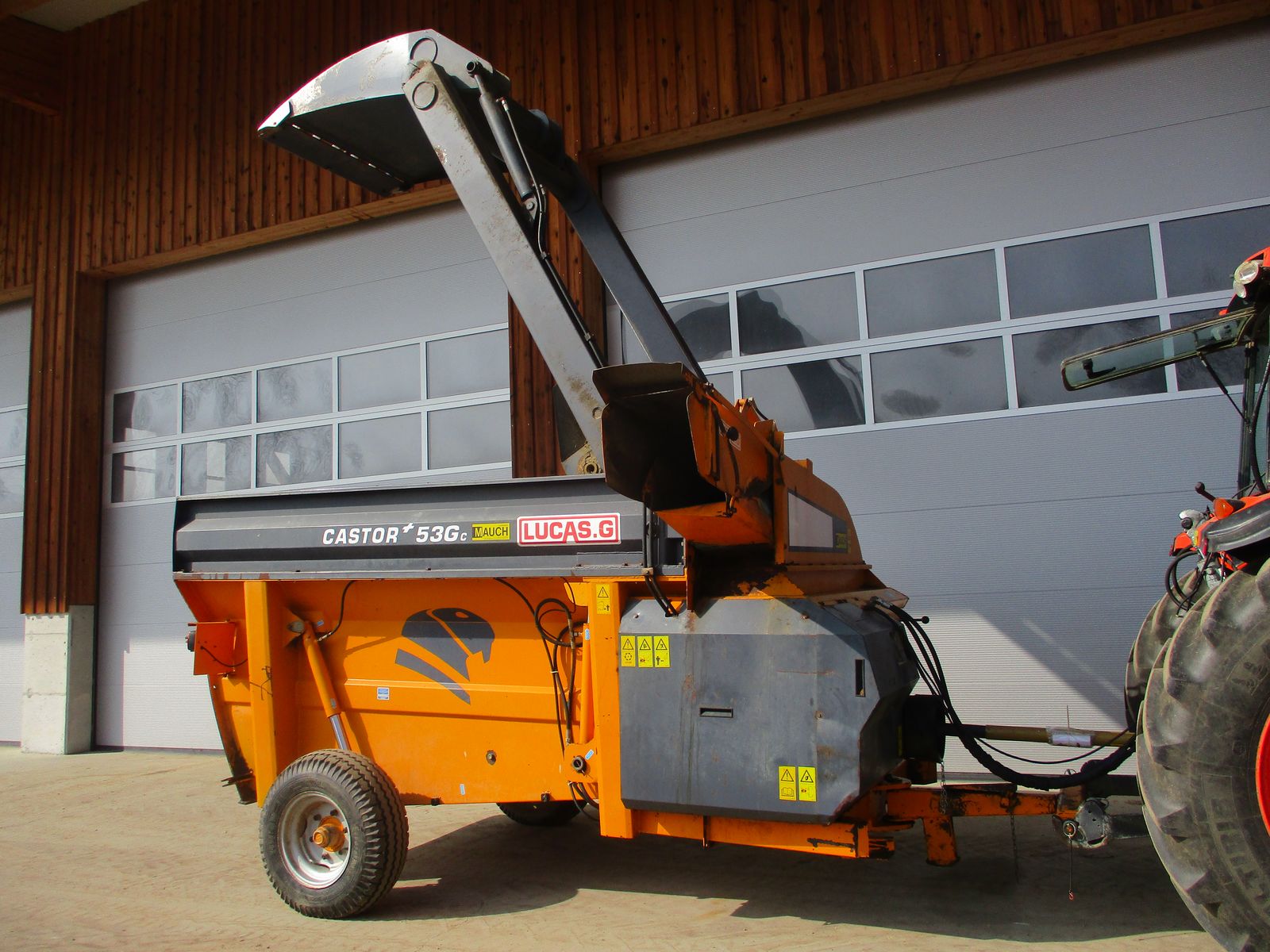 Einstreu- und Fütterungsmaschine für Quader- und Rundballen sowie für loses Heu und Stroh, mit Gelenkwelle angetriebenes Wurfrad und Zerkleinerungswalze, Kratzboden Hydraulisch steuerung mit Confort, Hydraulische HEckklappe zum Entnehmen von Silage und Rundballen.