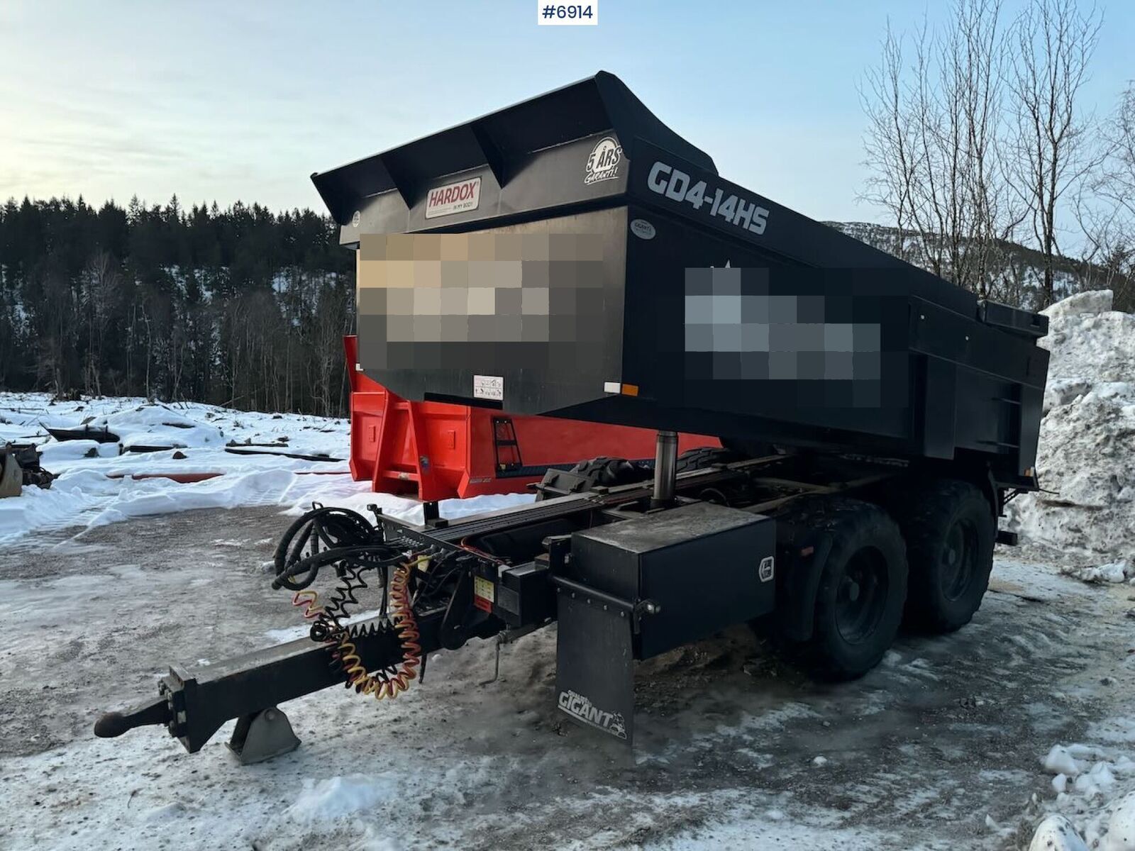 == Mer informasjon (NO) == mascus_category: dumptrailers Please provide reference number upon request: 6914 See en.landbrukssalg.no/6914 for more images Specifications: Model year: 2023 Tyres (see photos) Hydraulic tailgate Tyre size: 560/14.5 R22.5 Length: approx. 583 cm Width: approx. 254 cm Wheelbase: approx. 127 cm Unladen weight: approx. 4,730 kg Maximum payload: approx. 15,270 kg Tool box Description:2023 Gigant GD4 tractor trailer with hydraulic tailgate.There is a minor leak on the tipping cylinder.Available for delivery at short notice