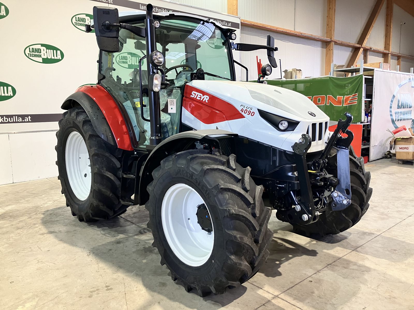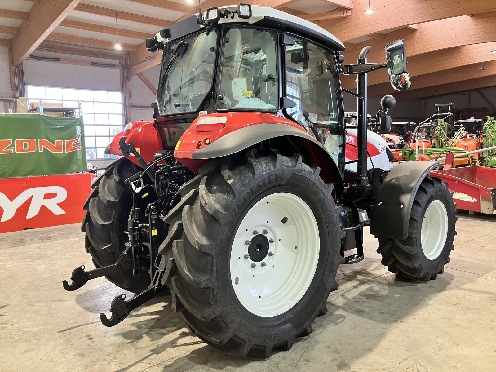 STEYR Plus 4190 + Neumaschine + Stufe V - 3,6 Liter Motor + Drehzahlspeicher + 24/24 Gang Getriebe mit Power Shuttle und Lastschaltung + S-STOP 2 Getriebefunktion + Stehenbleiben und Anfahren nur mit Bremspedal + optimierte Getriebesteuerung und Schaltverhalten + 40 km/h ECO Getriebe + einstellbares Power Shuttle + Bereifung: hinten 540/65 R 34und vorne 440/65 R 24 + Kotflügelverbreiterung hinten + 5x DW Zusatzsteuergeräte (3x DW Hecksteuergeräte und 2x DW mit original Kreuzhebel) + mechanischer Kreuzhebel mit Wendeschaltung, Drehzahlwechsler, Lastschaltung + EHR mit 2 Zusatzhubzylinder + Hubwerk- und Zapfwellenaußentaster + 540/750/1000 - 3-fach Zapfwelle + Zapfwellenautomatik + einstellbarer Zapfwellenanlauf + Luftsitz mit Horizontalfederung + Drehlicht + Fronthubwerk original + 2 Leitungen nach vorne + Frontelektrik + Klimaanlage + Batteriehauptschalter + höhenverstellbare Anhängevorrichtung + Ersatzscheinwerfer + Teleskopspiegel mit Weitwinkelteil + Multicontroller