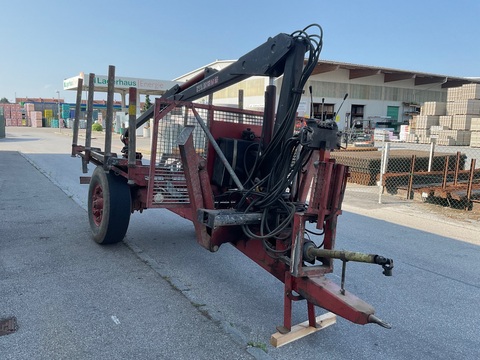 Forstanhänger mit starken Rahmen und geschlossene Ladefläche (Plateau) mit Stahlboden, 2 Rungenpaare, Beleuchtung, Zwillings-Bereifung, Penzkran 6, 7 m mit Teleskopa