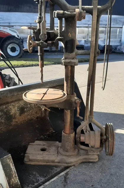 Sehr alte Ständerbohrmaschine, mit zusätzlichem E-Motor würde sie wieder komplett funktionieren. Atelier Équipement d’atelier