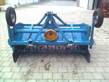 Reihenanzahl (2-reihig), Heckanbau________Reihenabstand 625 mm, Behältervolumen 180 kgMetallräder, Dreipunkt Gewicht der Maschine 210 kg, Kraftbedarf 28 kW /