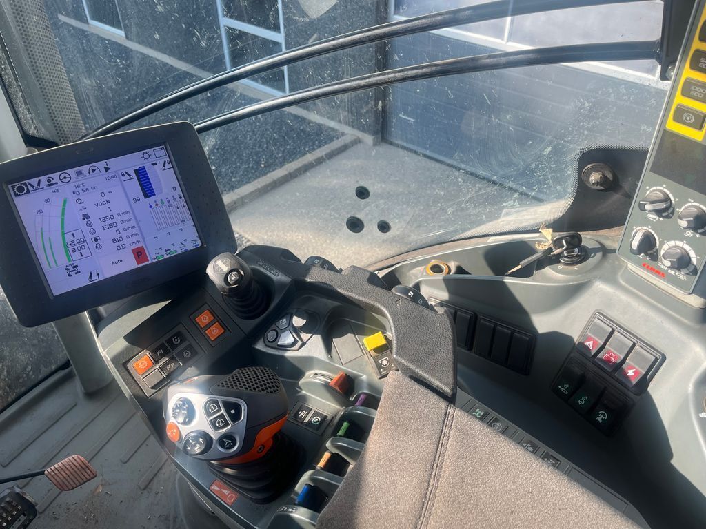 1 til hver side samt 10 arbejdslys fremad. I fronten er forakslen affjedret og der sidder en original frontlift med en dobbeltvirkende fjernudtag ført frem samt ISOBUS. Inde i kabinen er der luftsæde