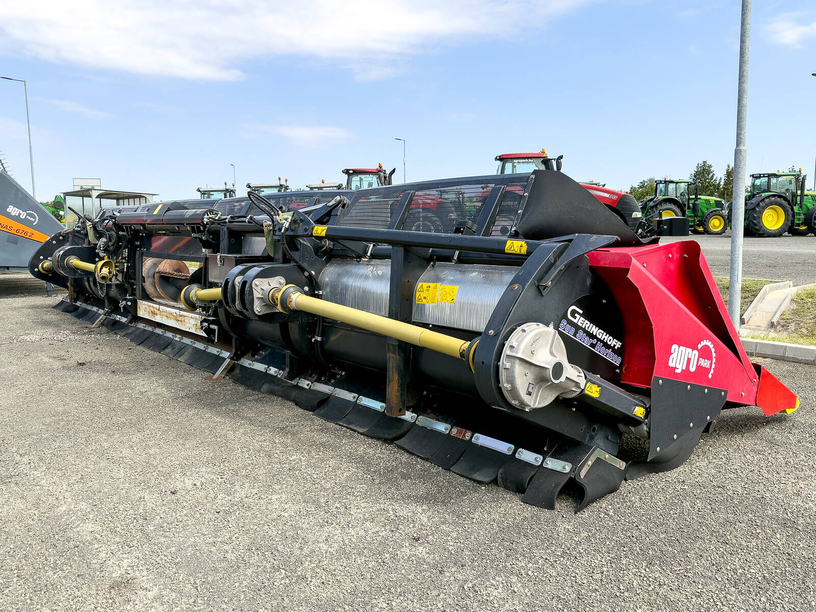 Geringhoff SF Horizon 1230/FB 12-reihiges Sonnenblumenpflücker mit John Deere und Claas Halterung, 75 cm Reihenabstand, klappbarer Rahmen, Stängelhäcksler Baujahr: 2013 Gewicht: 4280 kg Transportwagen: Nicht // ANDERE // - 12-reihiges, klappbares Rahmendesign - 75 cm Reihenabstand - Stängelhäcksler - Doppelantrieb - Vertikale Sammelketten - Rotierende, selbstschärfende Stängelschneidblätter - Kunststoffabdeckungen mit Luftfederung - Zentrale Sammelkettenspannung - Es hat sowohl John Deere als auch Claas Rahmen Bei Fragen stehen Wir gerne zur Verfügung. Telefon: siehe Kontaktinfo Wir bieten auch Transport in ganz Europa an. Agropark: 37843