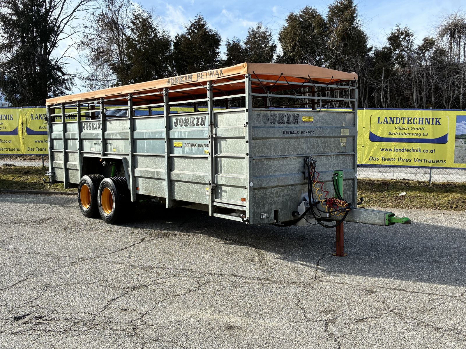 Joskin Viehanhänger RDS 7500, hydraulisch absenkbar, mit Tandemachse, vollverzinkte Ausführung mit Kunstharzboden, einteilige innere Trennwand mit 3 Einstellmöglichkeiten, Bereifung 435/45R-19.5 mit Druckluftbremse (Bremse neu überholt), vordere Einstiegstür, Dachplane, Doppeltür hinten, Beleuchtung, hydraulischer Stützfuß, prompt verfügbar.