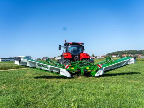 DEMOMASCHINE McHale B910 Baujahr: 2024 Arbeitsbreite: 9,10m Transporthöhe: 4m Gewicht: 2.760 kg Anzahl Scheiben: 14 28 Klingen Mähscheiben Drehzahl: 3.200 UPM Schnellwechselklingen Automatischer Anpassung des Balkenwinkels