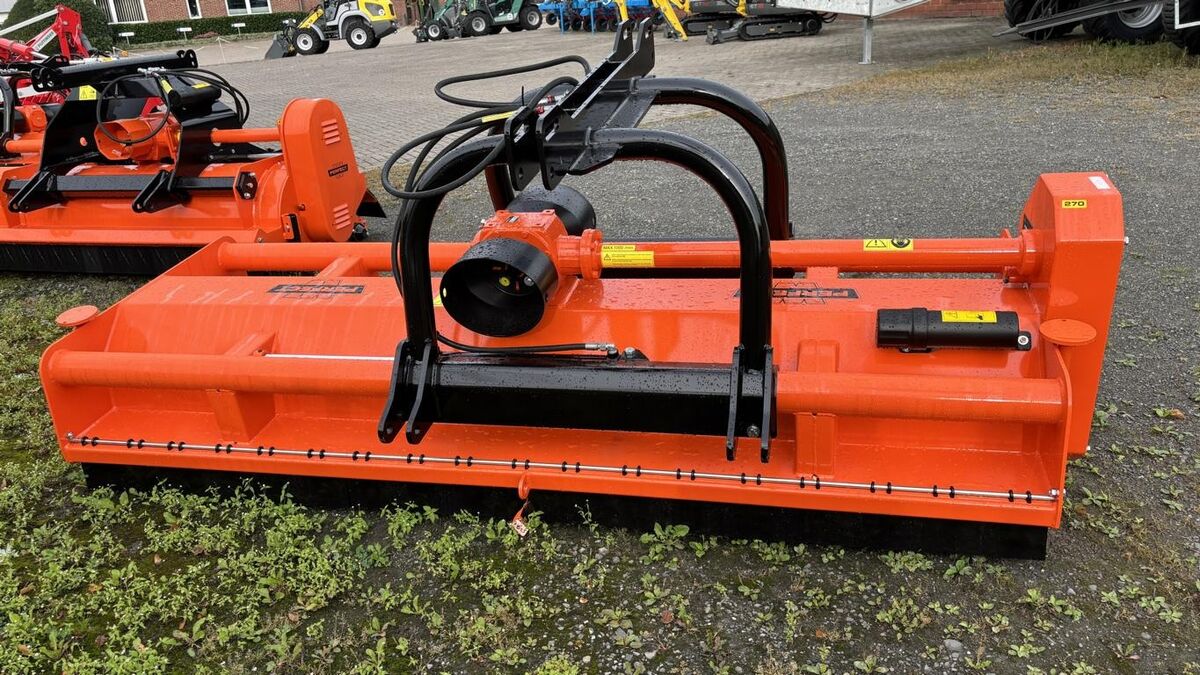 Front/Heck Schlegelmulcher, Hydraulische Seitenauslage 48cm, Drehrichtungsunabhängiges Zahnradgetriebe 1000 U/min mit doppeltem Freilauf, Automatische Keilriemenspannung, Gummiklappe, Anzahl der Schlegel: 28,