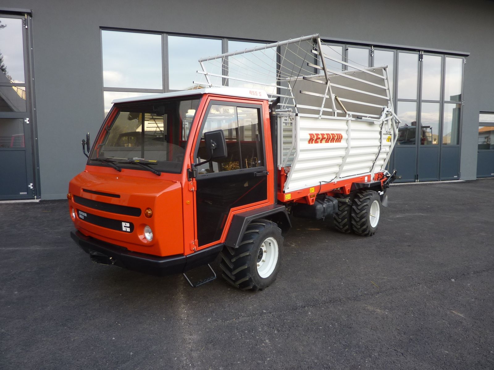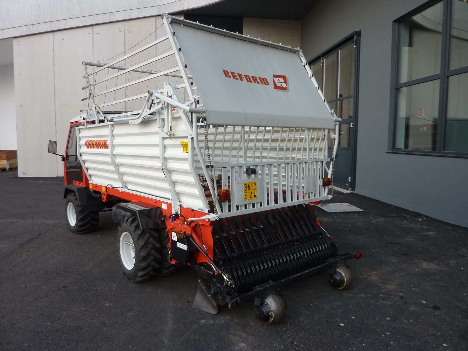 mit Aufbauladewagen REFORM mit 6 Schneidemesser, geschlossener Kabine, vorne Bereifung 31x15,50-15, hinten Doppelbereifung 10.0/75x15,3, kurzer Radstand, 3 doppeltwirkende Steuerventile mit Mengenregelung