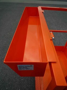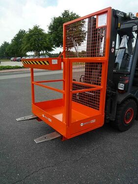NEUGERÄT: EURO-Jabelmann Arbeitsbühne, Modell V 1500 AB, für Gabelstapler, Teleskoplader usw. Zum Aufstecken auf die Gabelzinken. Befestigung mit Sicherungsbolzen. Riffelblechboden, Einstiegstür, Sicherheitsgitter, Ablagekorb für Werkzeug. Einfahrtaschen 190 x 100 mm. Pulverbeschichtung (Einbrennlackierung). Für max. 2 Personen zugelassen. Abgenommen durch die DEKRA. Korbhöhe ca. 1050 mm Korbbreite ca. 1100 mm Korbtiefe ca. 700 mm Max. Tragkraft ca. 300 kg Gewicht ca. 110 kg Frachtanteil bei Anlieferung EUR 125,-- zzgl. Mwst.