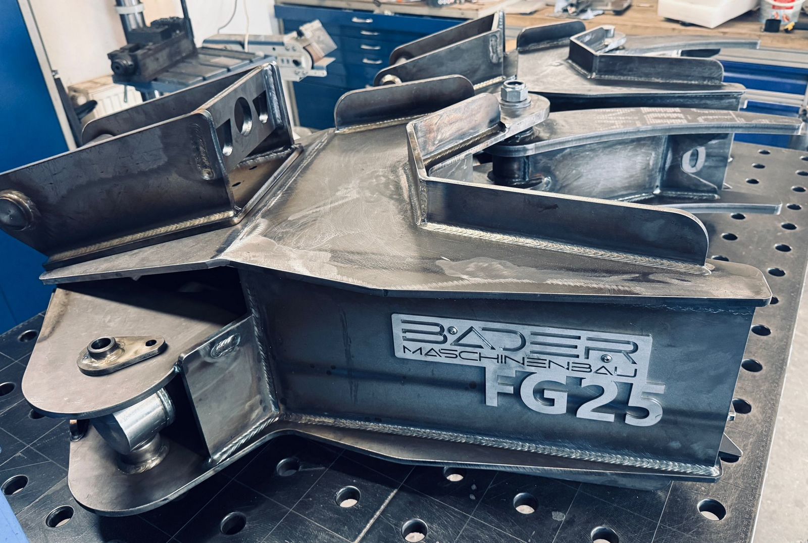 Fällgreifer für Minibagger als Bausatz FG20 Schnittleistung max. 20 cm Gewicht ca. 100 kg Greiferöffnung ca. 50 cm Trägerfahrzeug: 1,5 t bis 2,2 t Preis: € 1.690,- FG25 Schnittleistung max. 25cm Gewicht ca. 180 kg Greiferöffnung ca. 65 cm Trägerfahrzeug: 2,5 bis 5 t Preis: € 2.090,- FG30 Schnittleistung max. 30 cm Gewicht ca. 300 kg Greiferöffnung ca. 80 cm Trägerfahrzeug: 5 t bis 8 t Preis: € 2.690,- Gehärtete Buchsen mit Schmiernut Hauptwelle aus 42CrMo4 mit Schmiernut Bleche aus Hardox und legiertem Stahl. Schneide ungeschliffen Bleche mit Positionierhilfen zum einfachen Zusammenbau. Inklusive ausführlicher Aufbauanleitung Im Bausatz enthalten sind alle Blechteile, Buchsen, Bolzen, Schrauben, Schmiernippel und der Hydraulikzylinder. Es wird noch folgendes benötigt: - Lackmaterial - Hydraulikschläuche und die passenden Hydraulikkupplungen (kann direkt bei uns angefertigt werden!) - Aufnahme fürs Trägerfahrzeug Optional: Hydraulikschläuche 2 Stück 120 cm mit Anschluss 12L und Einschrauber 3/8 € 69,- Hydraulikkupplungen auf Anfrage Anbauplatte ohne Aufnahme € 35,- Anbauplatte mit MS01 € 69,- Anbauplatte mit MS03 € 79,- Anbauplatte mit MS08 € 149,- Andere Aufnahmen auf Anfrage. Sammler für FG20 (Bausatz) Gewicht: ca. 65 kg Preis: € 690,- Sammler für FG25 (Bausatz) Gewicht: ca. 80 kg Preis: € 890,- Rechnung mit ausgewiesener MwSt. Alle Preise inklusive 20% MwSt. Versandkosten auf Anfrage! Hersteller: Maschinenbau Bader
