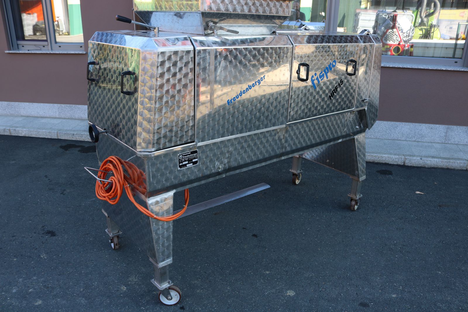 eschreibung: Diese Freudenberger Abbeermaschine aus dem Jahr 2000 ist eine robuste und leistungsstarke Lösung für die Traubenverarbeitung mit einer maximalen Leistung von 15 Tonnen pro Stunde. Der Kunststoffkorb und die komplett aus Edelstahl gefertigte Konstruktion garantieren Langlebigkeit und einfache Reinigung. Die stufenlose Geschwindigkeitsregelung über Variator ermöglicht eine präzise Anpassung an die Erntebedingungen. Gut zugängliche Wartungsöffnungen erleichtern die Instandhaltung. Das Fahrgestell mit zwei drehbaren und zwei festen Bockrollen sorgt für Flexibilität im Einsatz. Inklusive Quetschgruppe – ideal für Winzer und Keltereien. Technische Daten & Ausstattung: Maximale Leistung: 15 t/h Kunststoffkorb Stufenlose Geschwindigkeitsregelung über Variator Komplett aus Edelstahl gefertigt Fahrgestell mit 2x drehbaren und 2x festen Bockrollen Inklusive Quetschgruppe Baujahr: 2000 Guter Zustand Besonderheiten: Hohe Verarbeitungsleistung bei schonender Traubenbehandlung Langlebige Edelstahlausführung Einfache Wartung durch gut zugängliche Öffnungen Flexibler Einsatz dank mobilen Fahrgestells