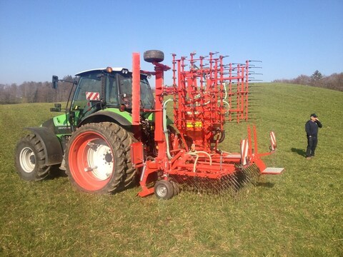Übersaatgerät von Einböck Pneumaticstar Pro 600 mit Arbeitsbreite 6 m,Frontstreifblech,4 Felder à 60 Zinken 8x490 mm.Belüfdet die Grasnarbe, arbeitet Verfilzungen heraus, regt die Bestockung an und schliesst die Lücken mit wertvollen Futtergräsern.----------------------------------------Semoir pneumatique Einböck Pneumaticstar Pro 600 avec une largeur de travail de 6 m,plaque d'essuie-glace avant,4 champs de 60 dents 8x490 mm.Aère le gazon, élimine les enchevêtrements, stimule le tallage et comble les lacunes avec de précieuses graminées fourragères.