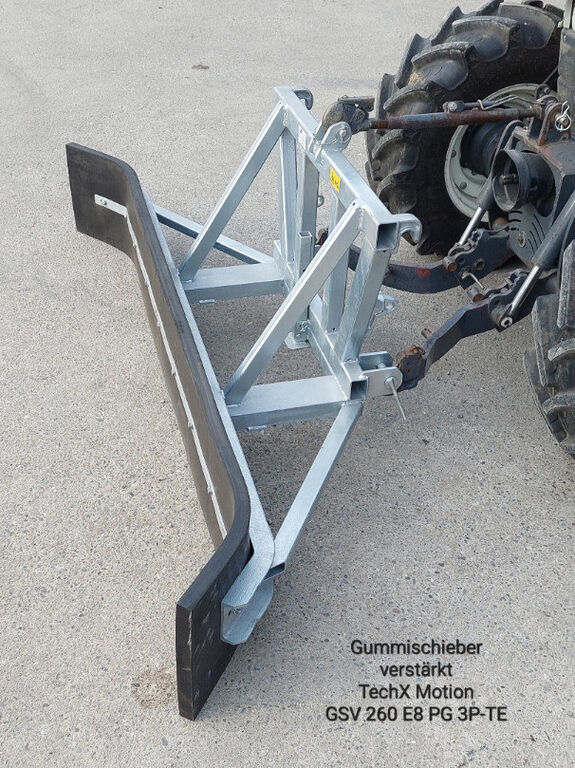 Gummischieber verstärkt, 2.6 m, Euro 8-, Palettengabel- u. Dreipunkt-Aufnahme, Gummileiste mit Stahldraht-Einlage, FeuerverzinktTechX Motion GSV 260 E8-PG-3P-STGewicht ca. 200 kgNettopreis CHF 1380.- inkl. MwSt- mit Arbeitsbreite 2.2 mTechX Motion GSV 220 E8-PG-3P-STGewicht ca. 190 kgNettopreis CHF 1330.- inkl. MwStAuch erhältlich:- 2.6 m mit Textilgewebe-EinlageTechX Motion GSV 260 E8-PG-3P-TEGewicht ca. 200 kgNettopreis CHF 1430.- inkl. MwSt- mit Arbeitsbreite 2.2 mTechX Motion GSV 220 E8-PG-3P-TEGewicht ca. 190 kgNettopreis CHF 1380.- inkl. MwStSchmutzschieber für die Reinigung und zum Räumen von Plätzen, Wegen und Futtergängen.Das ideale Anbaugerät zum Schieben von Schüttgut wie Sand, Kies, Schnee, Holzschnitzel, Laub, Silage, Futterresten, Mist, Kot, Gülle usw.Nutzen Sie ein bestehendes Fahrzeug und reinigen Sie damit zB Ihre Spaltenböden oder den Laufhof!Das Gummischiebeschild passt sich dank der Gummileiste sehr gut den Unebenheiten des Bodens an.Passt an Radlader, Hoflader, Teleskoplader, , Gewicht:200
