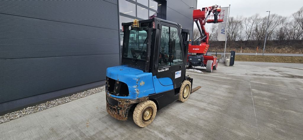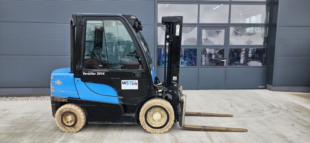 Bauart: Frontstapler / Dieselstapler, Tragkraft: 3000kg, Hubhöhe: 4615mm, Bauhöhe: 2180mm, Gabellänge: 120mm, Bereifung vorne: Superelastik Einfach , Bereifung hinten: Superelastik Einfach , Sonderausstattung: 3. Ventil, Arbeitsscheinwerfer hinten, Arbeitsscheinwerfer vorn, Heizung, Vollkabine, Scheibenwischer, Sitz,