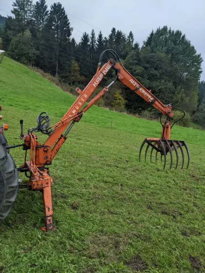 Köppl Heckbagger/Mistgreifer mit Eigenölversorgung (Zapfwelle), Dreipunkt-Anbau, Hebelsteuerung mit Sitz, A-Stützen, inkl. Baggerlöffel und Greifer. Betriebsbereiter