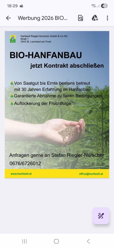 Auch heuer gibt es wieder die Möglichkeit, Bio Hanf für die Hanfwelt Riegler-Nurscher anzubauen. Wir bieten vom Saatgut über beratende Betreuung von Anbau bis hin zu