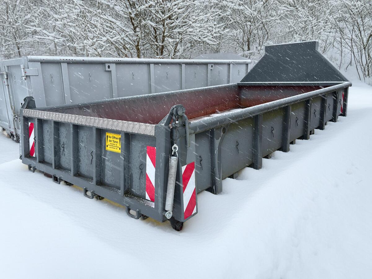 Abroll Container - Ladepritsche L x B x H: 5,0 x 2,3 x 0,6 m (6,9 m3) Boden: 6 mm Seiten/Stirnwand/Türen: 4 mm Hakenhöhe: 1570 mm Rahmen Rundrohr: DM 89 mm Spantenabstand: 750 mm Farbe: RAL 7043 Anthrazit Hinten Kombiklappe mit Federentlastung bis 7 T befahrbar, Zentralverriegelung Tragkraft: 15 T Baujahr 2021 - neu