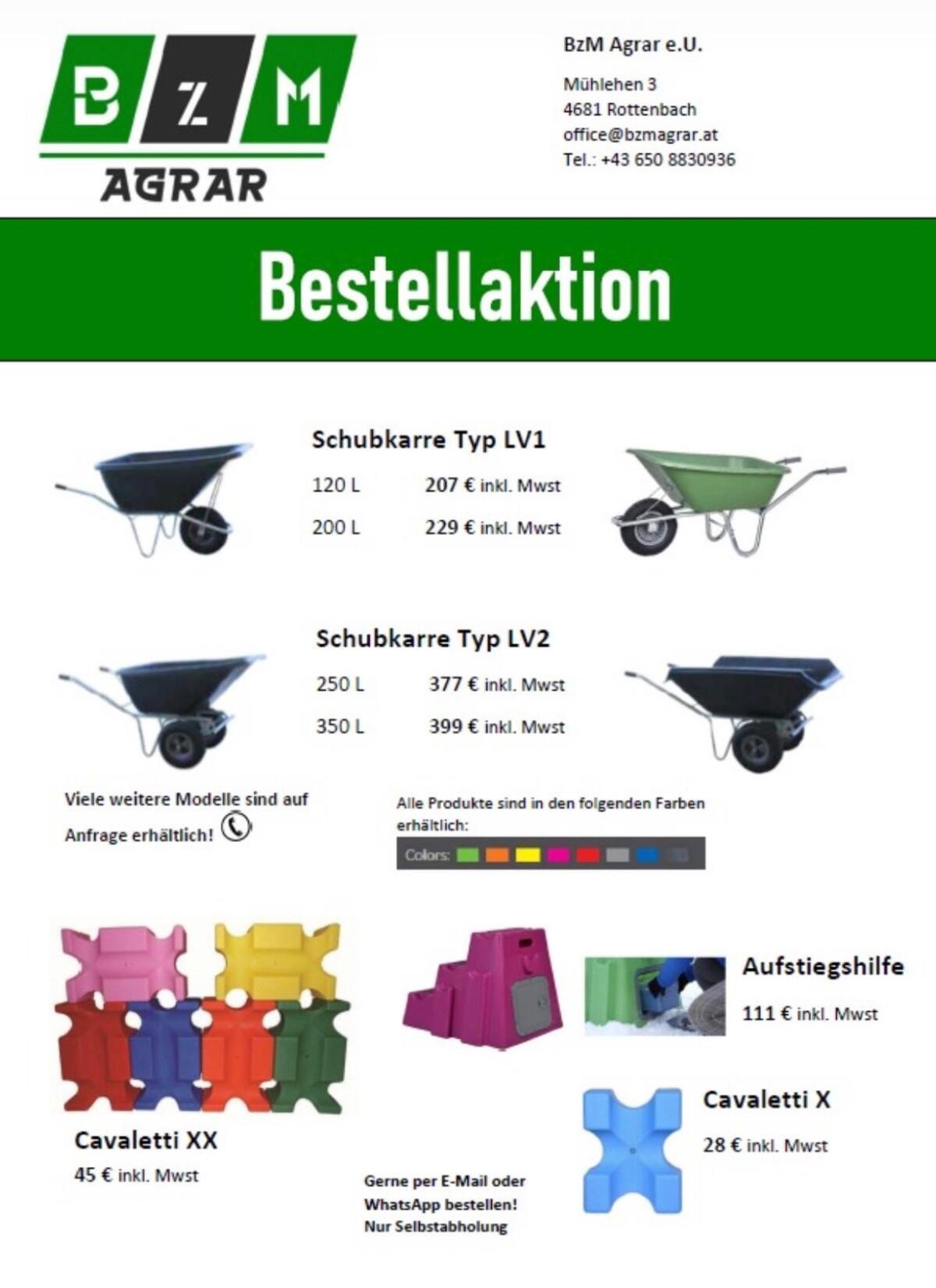 Wir verkaufen hochwertige Schubkarren, Cavalettis, Austiegshilfen zum Bestpreis. Nich jetzt von unserer Bestellaktion profitieren! BzM Agrar e.U.