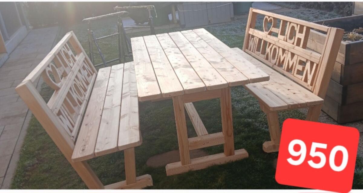 Gartenbank aus Lärche, massiv und robust, mit Spruch. Auch in Fichte und mit anderen Sprüchen möglich. Länge 1,95 m, Höhe 96 cm, Tiefe 43 cm, Sitzhöhe 45 cm.
