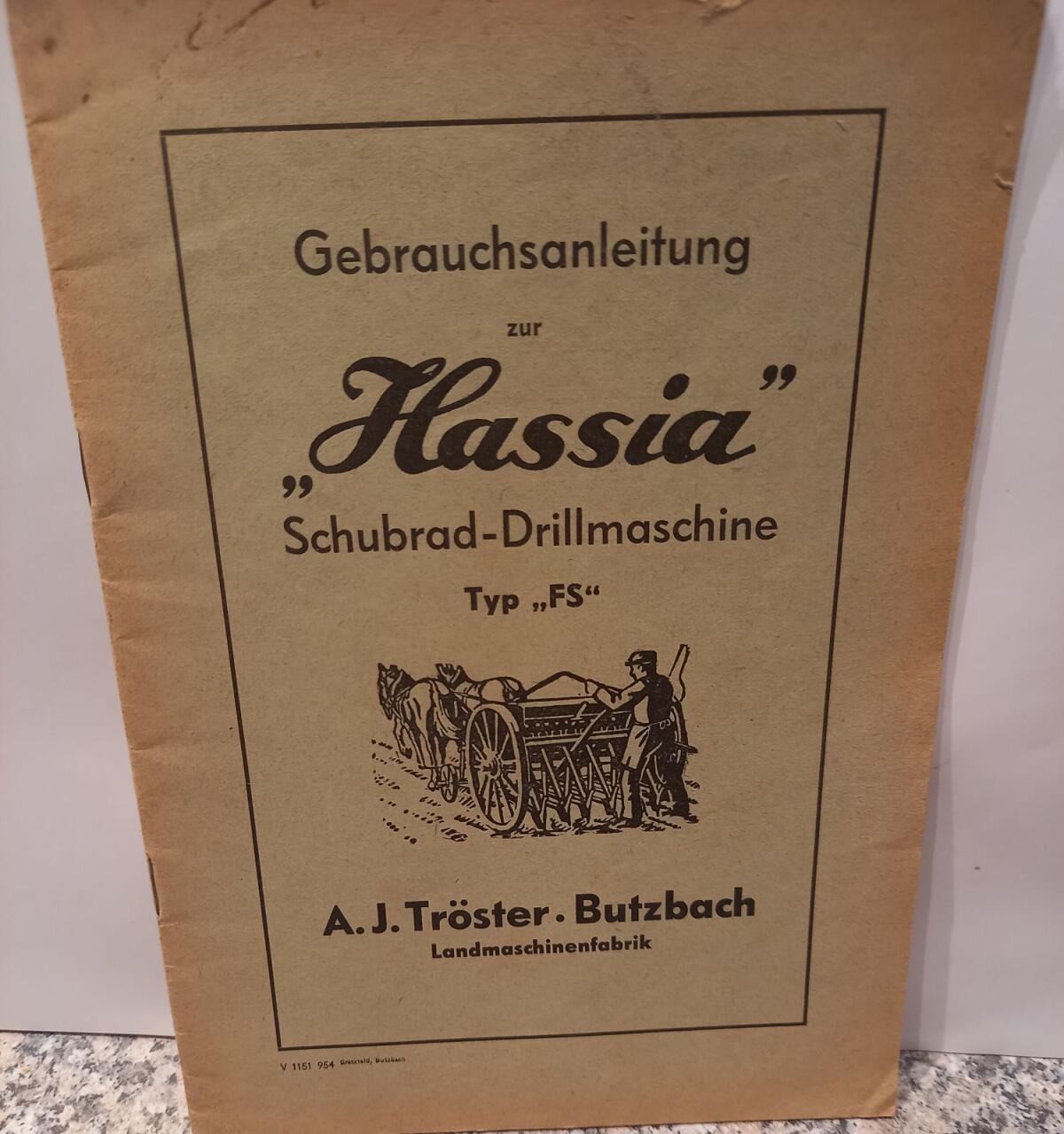 Gebrauchsanleitung Hassia Drillmaschine Typ FS, Landmaschinen Fabrik Tröster Butzbach, inkl. Versand für € 19,-, inkl. Versand nach Österreich € 22,-.