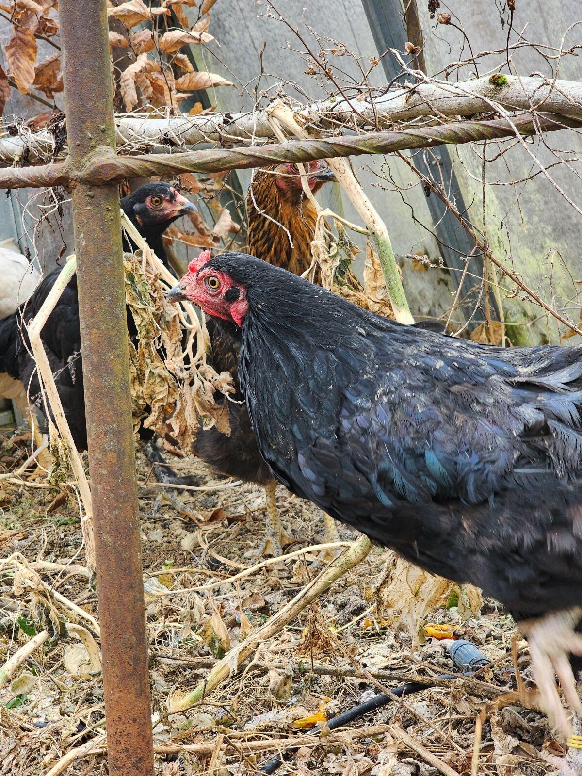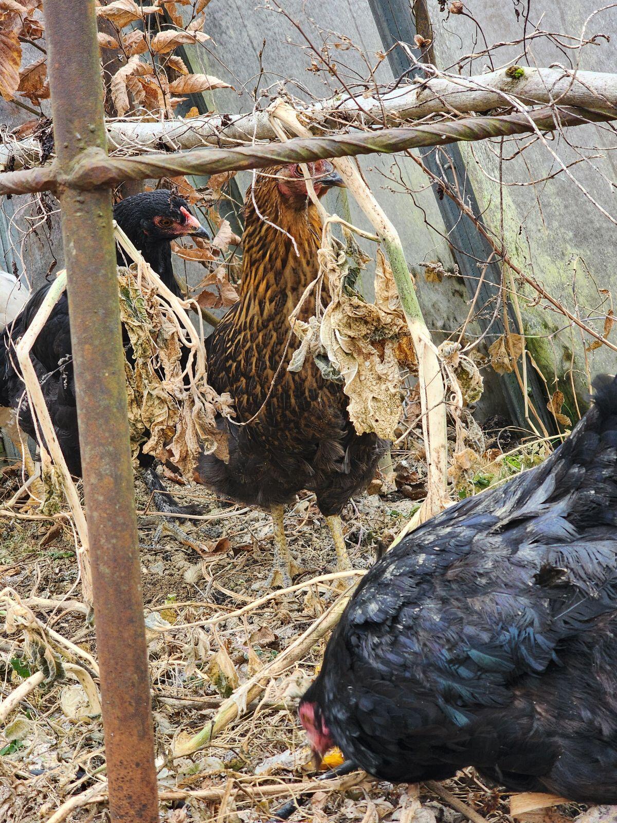 4 Hennen zu abgeben, fangen gerade an zu legen. Rasse bunter Mix. Farben: ein weißes, ein schwarzes und zwei goldbraun-schwarze.