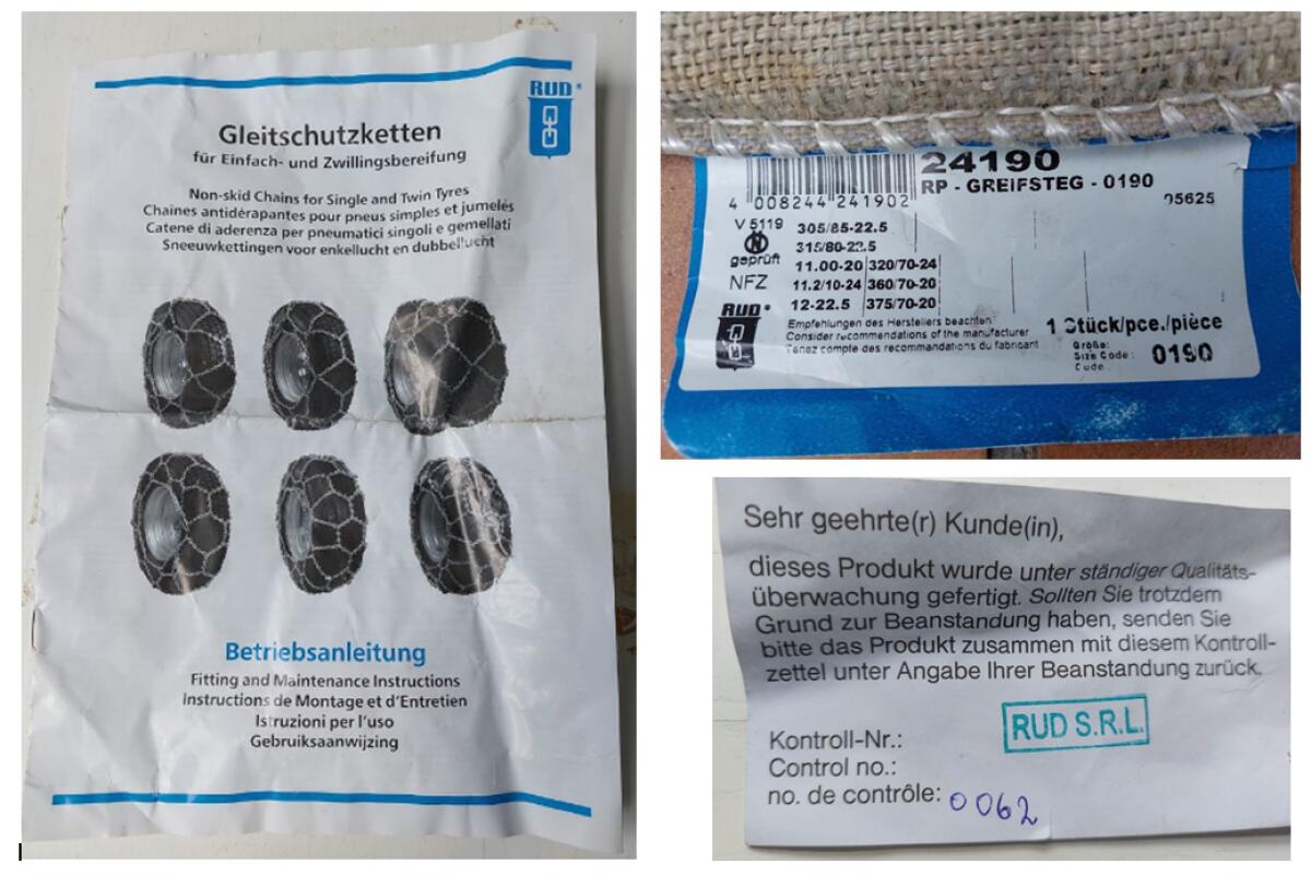 Verkaufe 2 Lkw-Schneeketten, RUDprofi Greifsteg 0190. Reifengrößen siehe Foto. Die Ketten wurden nie benutzt, keinerlei Gebrauchsspuren. Wegen feuchter Lagerung jedoch stellenweise Flugrost. Die Ketten sind komplett wie ausgeliefert inkl. Ersatzglieder, Betriebsanleitung und Kontrollbeleg. Lt. Hersteller handelt es sich um wendbare Ketten. Auch als Zwillingskette ausgeführt. Zusätzliche Greifstege mit spezialgeformtem Greifprofil, kompakte Laufnetzglieder verbessern Bruchfestigkeit und Laufruhe, höhere Verschleißfestigkeit. Buggeschweißt, Chrom-Mangan-Nickel legierter Edelstahl. Als Zwillingskette besonders geeignet bei starken Steigungen, Gefällstrecken, Passfahrten oder im Wald.