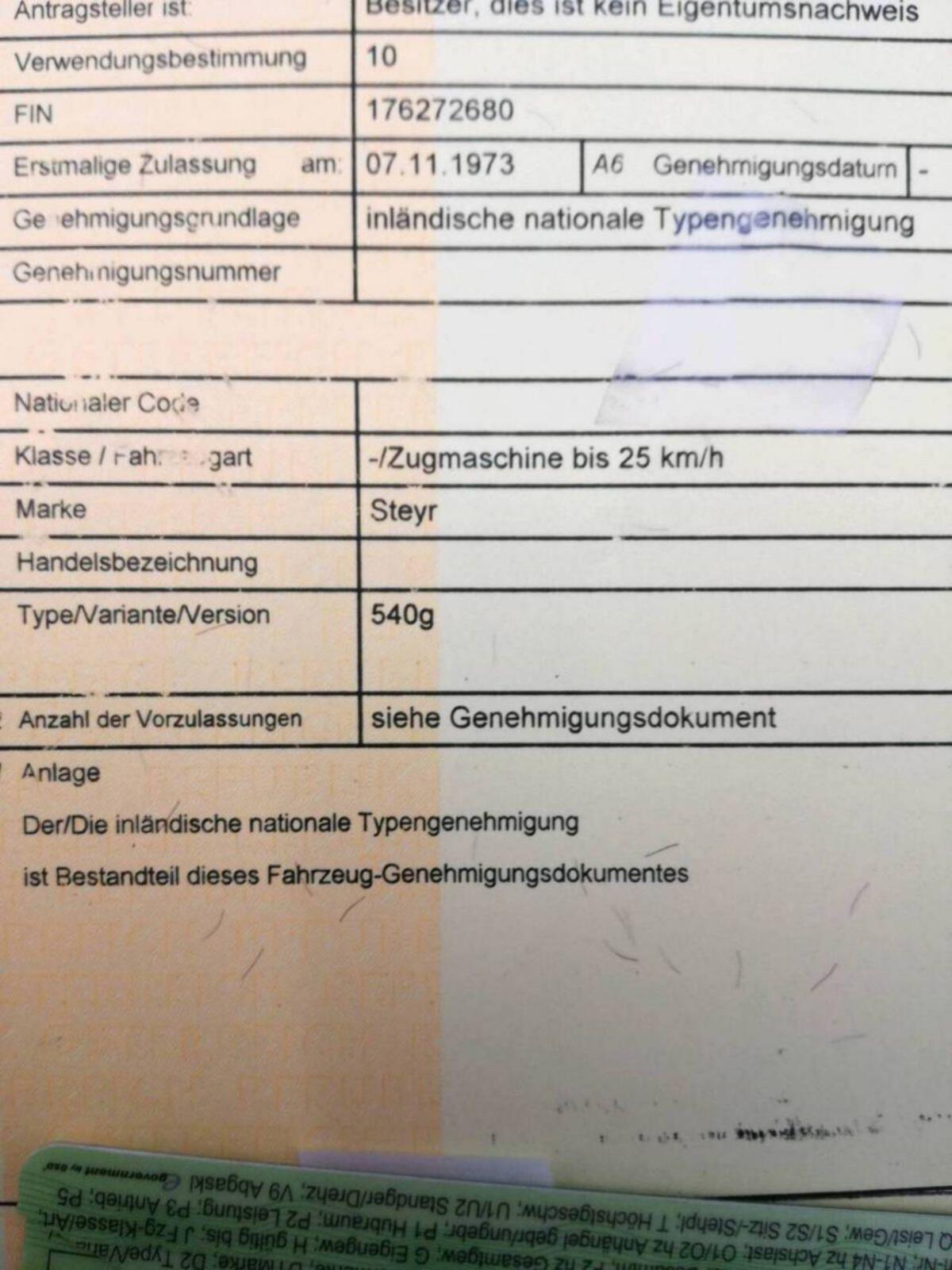 Verkaufe Sammler Typenschein für Steyr 545.