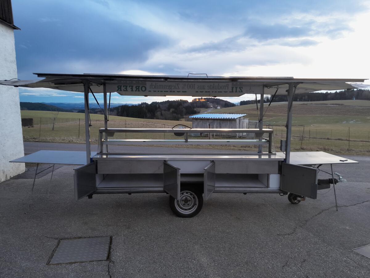 Verkaufsanhänger mit Kühlaggregat der Marke Seyr: Außensteher Marktanhänger mit Kühlvitrine aus Glas und Kühlfächern (Edelstahl), ausklappbaren Tischen links und rechts Anhängekupplung und Bremse neu Baujahr 1999