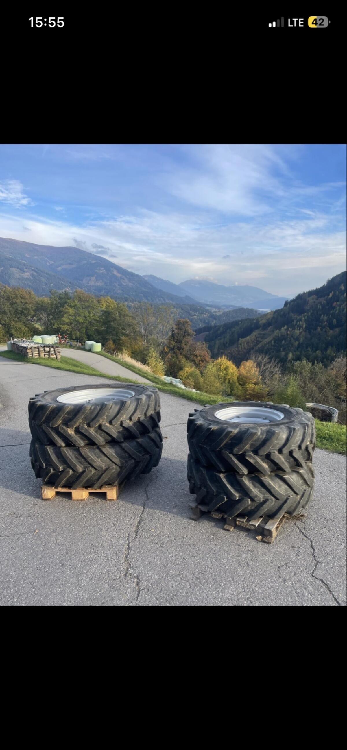 Verstellfelgen, Komplettreifensatz. Vorne 380/85 R24, hinten 420/85 R34. Abmaße: Vorne: 380/85/R24, Nabendm. 110 mm, Lochkreisdm. 15,5 cm (Schraube, Schraube 60 mm). Hinten: 420/85/R34, Nabendm. 140 mm, Lochkreisdm. 20,5 mm (Schraube, Schraube 80 mm). Verkaufsgrund: wegen breiterer Bereifung. Felgen und Profil sind in gutem Zustand. Weitere Fragen bitte melden. Preis: VB.
