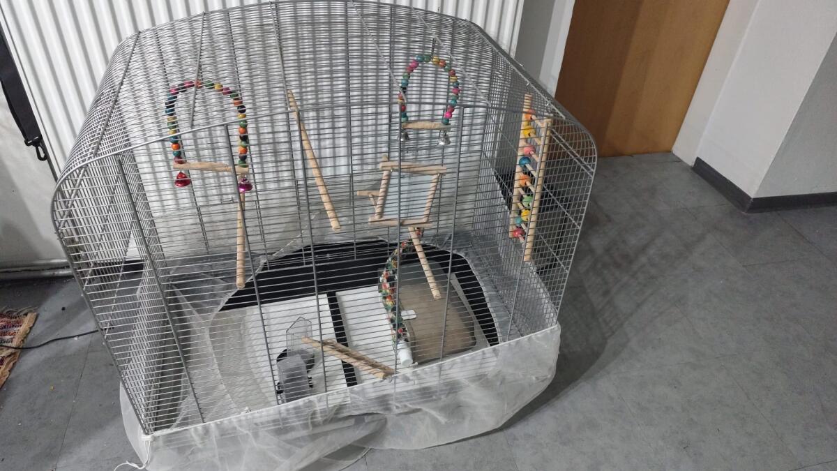 Vogelkäfig, Länge 77 cm, Höhe 79 cm, Breite 47 cm, mit Wasserbad und 2 Futternäpfen in 3522 abzugeben.
