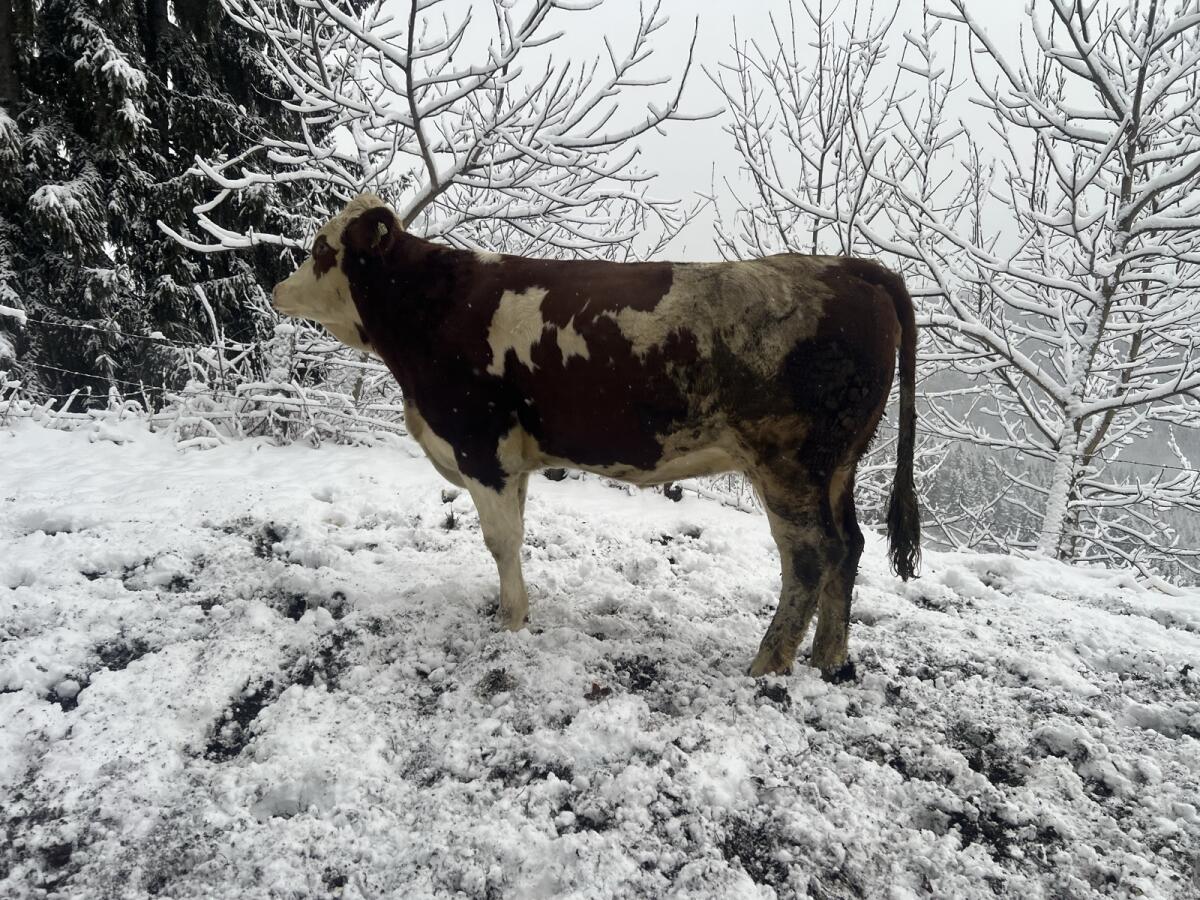 Extrem großrahmige Fleckviehkalbin mit RedHolstein-Einschlag, mit top Euteransatz aus Anbindehaltung zu verkaufen, halfterführig und gutmütig.