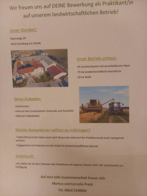 Wir bieten für den Sommer und Herbst einen Praxisplatz an. Wir betreiben einen gemischten Betrieb mit Milchvieh, Rindermast, Ackerbau und Grünland und ein Lohnuntern
