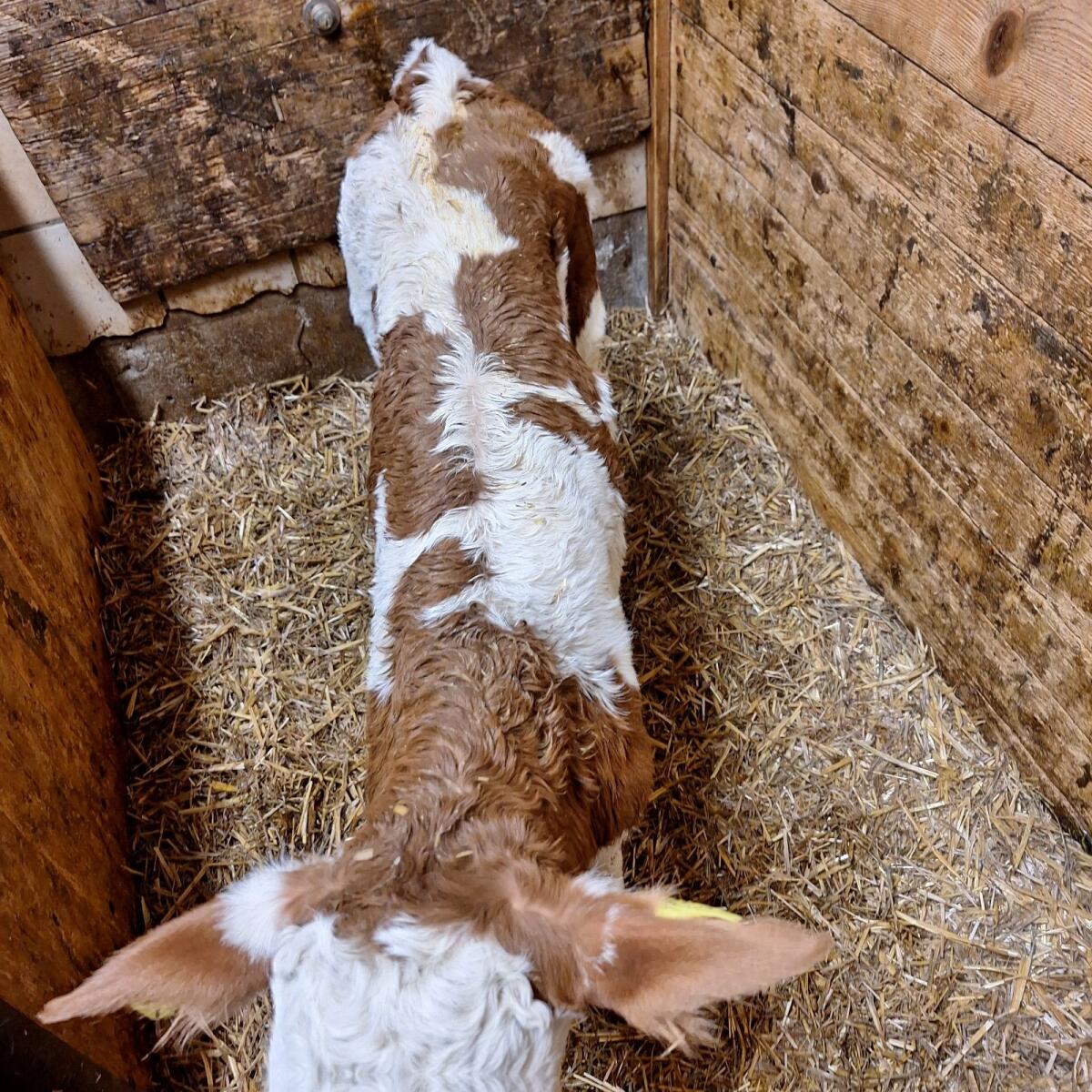 Verkaufe ein Mischlings-Stierkalb (25% Fleckvieh und 75% Braunvieh), geboren am 08.09.2025. Das Kalb ist gesund, vital und gut entwickelt, zeigt eine gute Bemuskelun