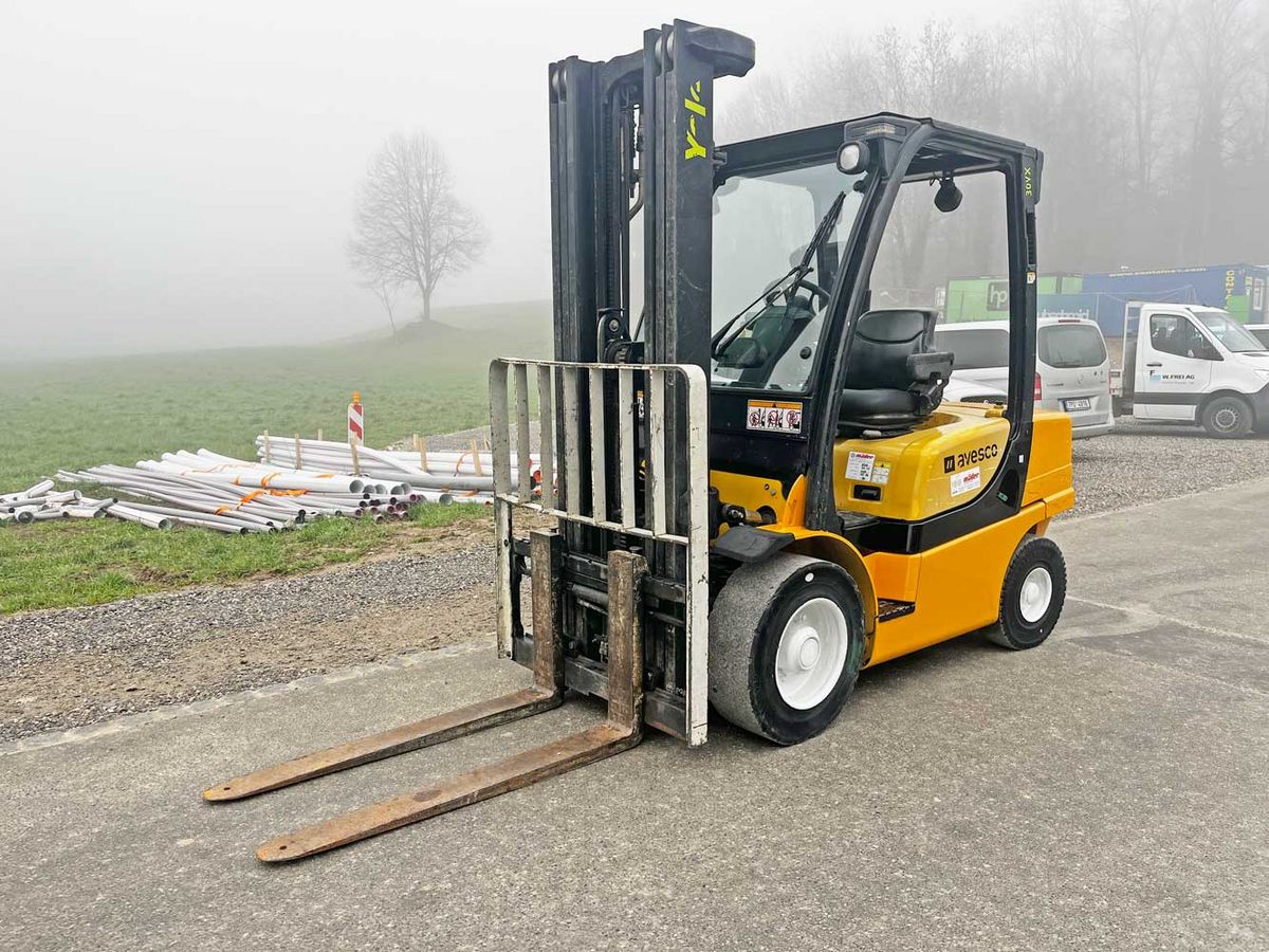 Diesel-Motor ohne PartikelfilterDuplex Mast Hubhöhe 3.2mSeitenschubVollgummireifenOhne Strassenzulassung, ohne BeleuchtungHubkraft: 2225kgEigengewicht: ca. 4392kgAb