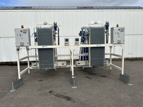 Unisorting Sammo Doppelkistenfüllmaschine mit ElevatorenSammo Ladestation für Palettenboxen, Modell: RIEMPITORE BINS RBCKistenbreite max 190 cmKistenhöhe max 150 c