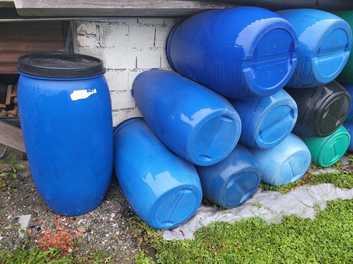 Verkaufe stabile blaue Kunststofffässer (30 l und 60 l) mit Deckel und Spannring zum luftdichten Verschließen. Ideal zur Lagerung von Lebensmitteln, Flüssigkeiten, G