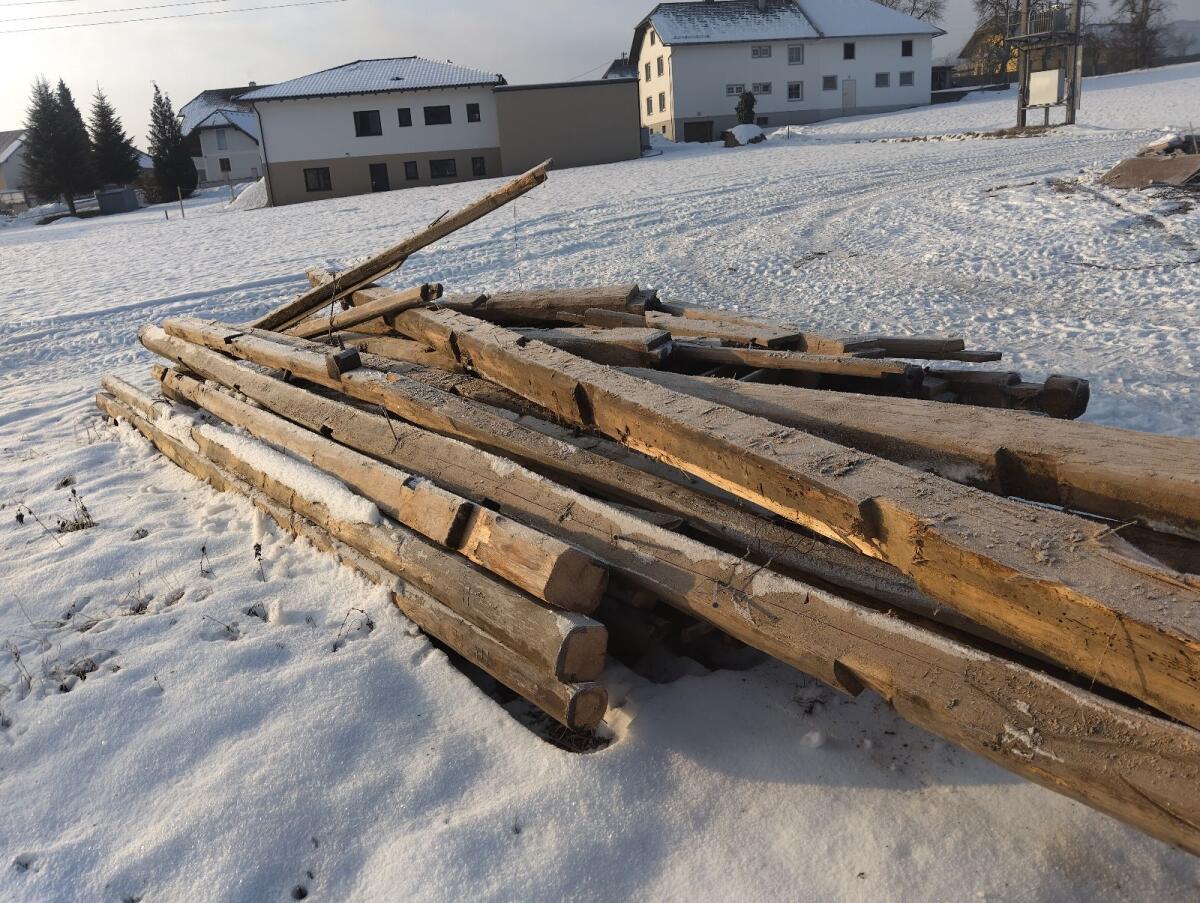 Verkaufe handgehackte Altholzbalken, 3-8 m Länge, Bretter ca. 1,5-3 m Länge.