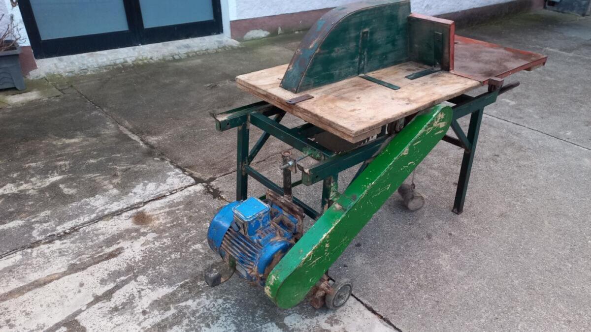 Robuste Kreissäge zum Brennholzschneiden. Rolltisch mit Eisen belegt, 700 mm Schneidblatt, 5,5 kW Starkstrommotor mit 2 Keilriemen angetrieben. Transporträder mit Hebevorrichtung und abnehmbaren Transportgriffen. Winkelgetriebe für Zapfwellenbetrieb und Anbauvorrichtung für Traktor optional erhältlich (€ 150,-).