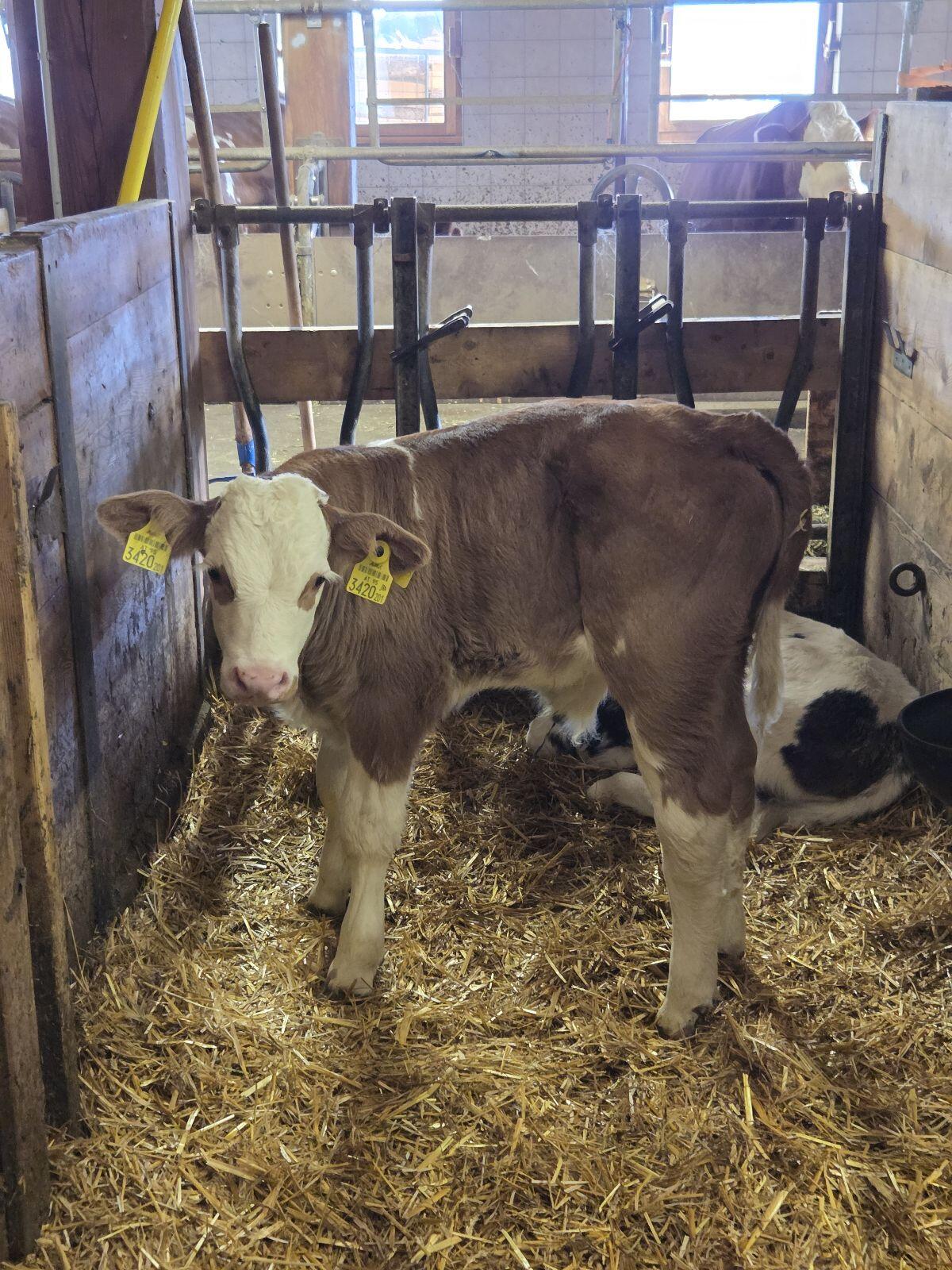 Eladó Fleckvieh bio tenyészbika Willi, 4 hetes. Anya: Walli 37 l 4,45 zsír 3,23 fehérje. Apa: Megerstar Pp*.