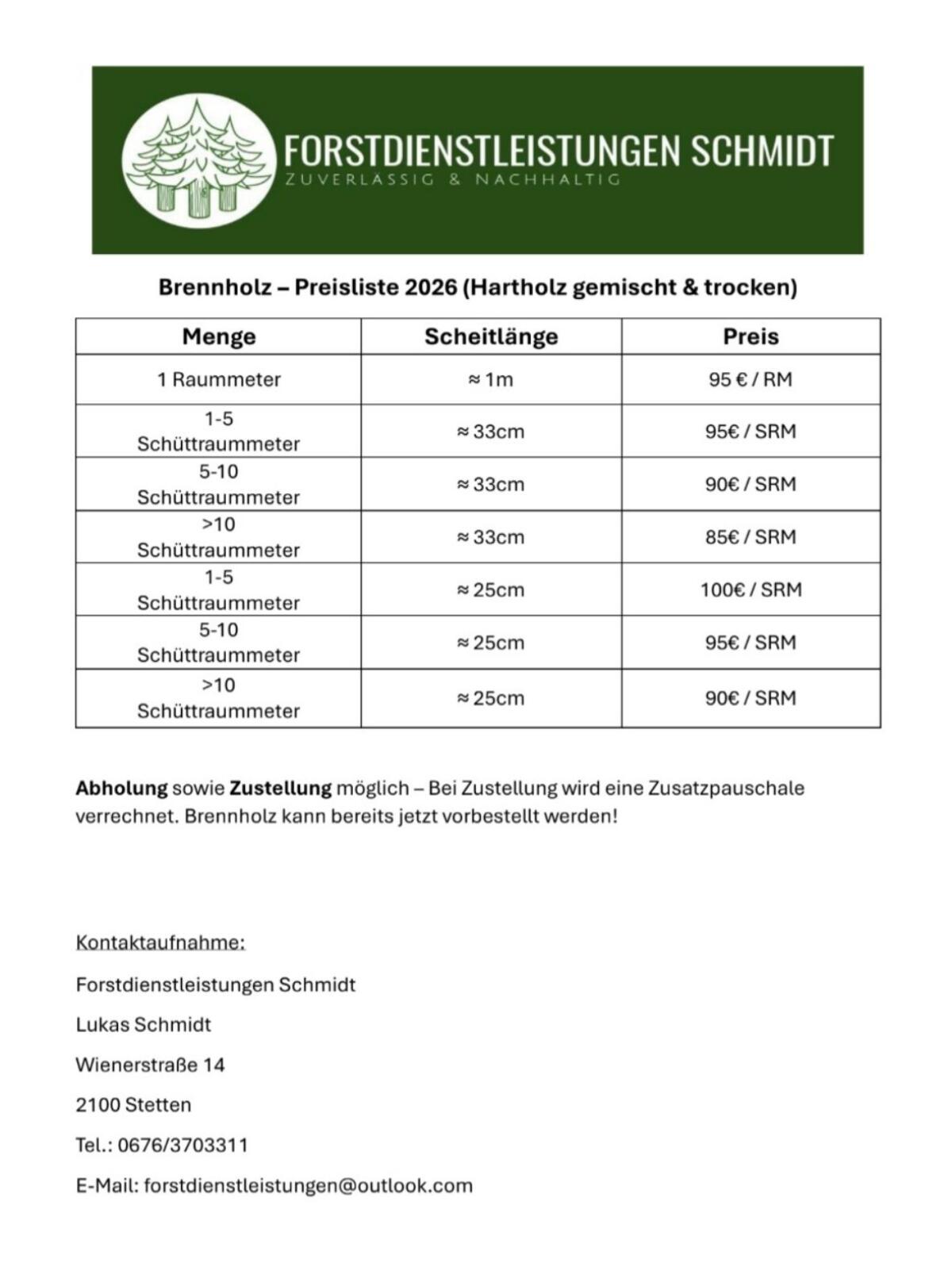 Servus, wir sind Forstdienstleistungen Schmidt - Ihr zuverlässiger Partner in Sachen Holz. Wir bieten im Raum Stetten und Umgebung verschiedenste Dienstleistungen an: Holzschlägerung und Holzbringung, Durchforstungen für einen nachhaltigen Bestand, Beseitigung von Gefahrenbäumen/Windwurf, Baumabtragungen, Brennholzverkauf/Stammholzankauf. Sofern Sie auf der Suche nach einem Dienstleister mit Handschlagqualität sind, sind Sie bei uns genau richtig. Brennholz ist ab Mai 2025 verfügbar und kann bereits jetzt vorbestellt werden - Preisliste im Anhang. Wir freuen uns auf Ihren Auftrag/Ihre Bestellung.
