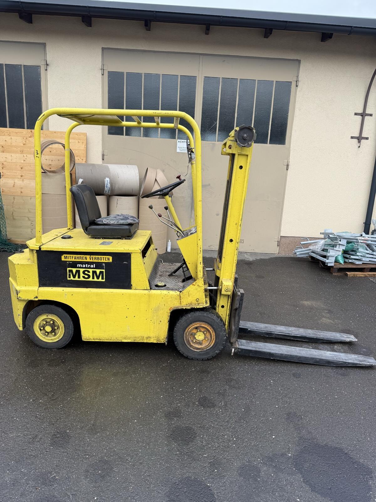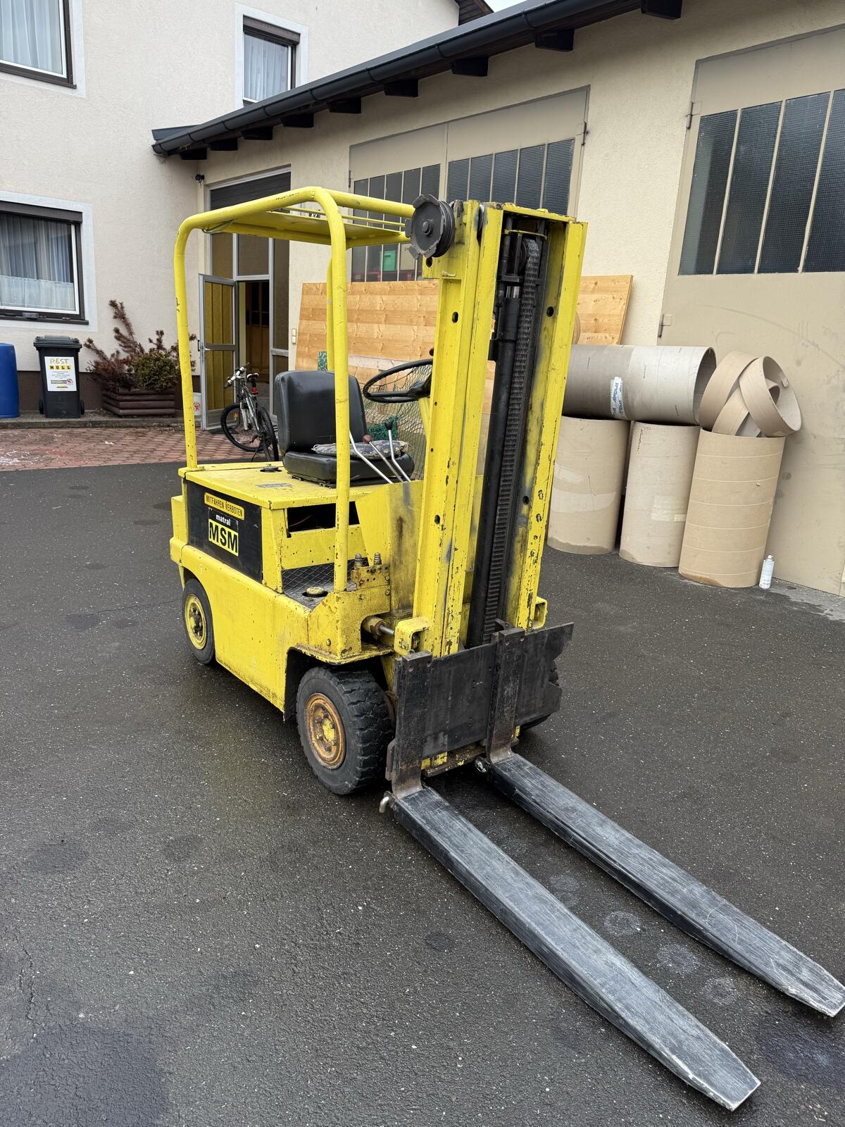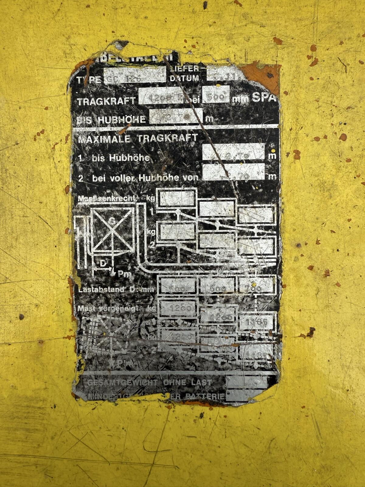 2,7 m Hubhöhe, Hubkraft ca. 1,7 t, hydr. Schaufel ist auch dabei. Mängel: Bremse muss nachgestellt werden, Benzinpumpe undicht, Ölverlust.