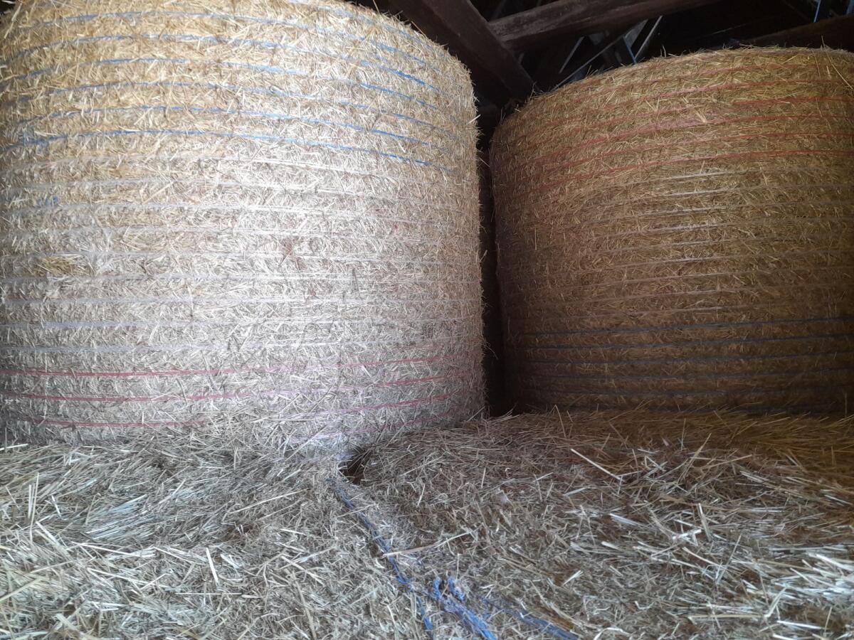Heuballen zu verkaufen. Dm. der Ballen ist 140 cm.